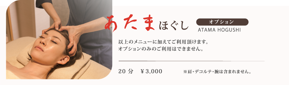 - ・ご入浴後の施術をおすすめいたします。フェイシャルトリートメントはお化粧を落としてください。
